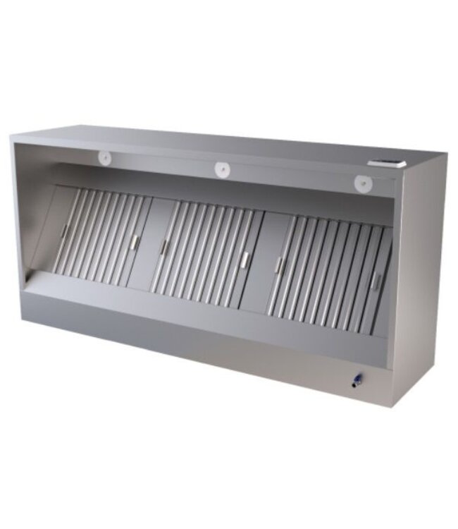 Complete afzuigkap uitgevoerd in een rechthoekig model. Dit doosmodel afzuigkap hoeft alleen bevestigd te worden en worden aangesloten op een stroomvoorziening om in gebruik te nemen. Hierna is met de gemakkelijke bediening aan de voorzijde van de afzuigkap de motor en verlichting in te stellen.