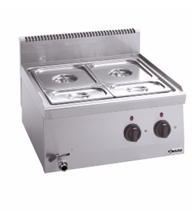 Elektrische Bain-marie groot van Bartscher. Onderdeel van de 600 Imbiss serie van Bartscher bestaande uit professioneel keukenapparatuur voor een groot vermogen met beperkte afmetingen en een handige samenstelling. Apparatuur gemaakt van roestvrijstaal 18/10 voor een lange levensduur. 600 Imbiss serie is laag in energiegebruik en gemakkelijk schoon te houden.