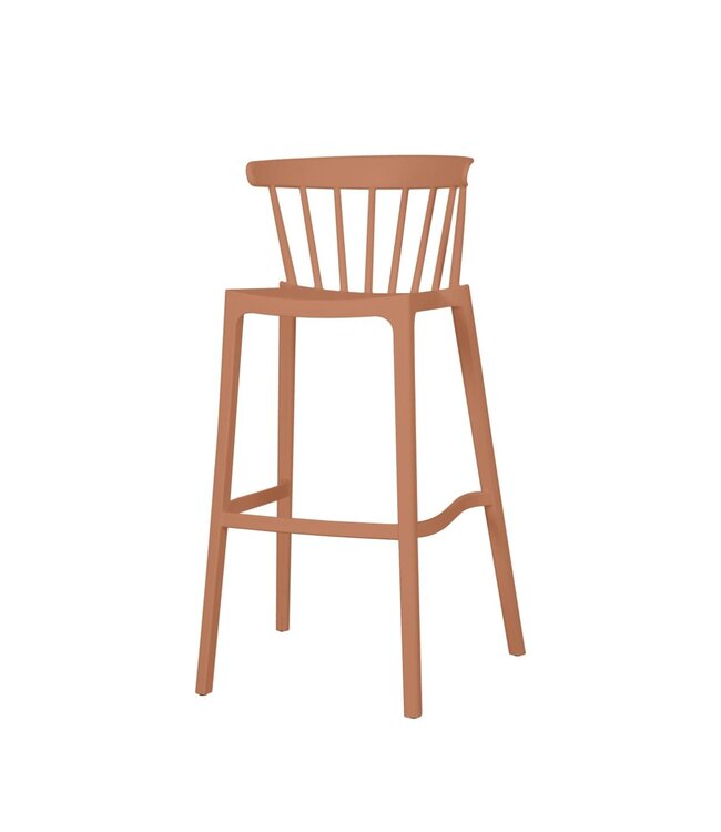 Barstoel Windson met klassiek design in terracotta kleur gemaakt van kunststof. Ideaal voor restaurants, bars en andere horeca gelegenheden. Barstoel compleet gemaakt van polypropyleen kunststof waarmee ze zeer geschikt zijn voor binnen- en buitengebruik. Deze barstoelen zijn stapelbaar waarmee ze compact en ruimtebesparend kunnen worden opgeborgen. Ontwerp met afgeronde hoeken dat eenvoudig schoon te maken is.