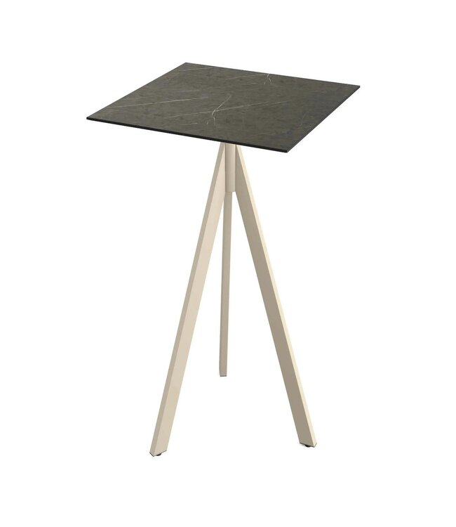 Infinity Tripod Bartafel met beige drieteens onderstel en een vierkant tafelblad gemaakt van HPL (High Pressure Laminate). Vierkante horeca tafel met een Midnight Marble marmerlook tafelblad geschikt voor moderne restaurants en gezellige terrassen. Na gebruik klapt u de Infinity Tripod tafel weer eenvoudig in. Ruimtebesparend wanneer u de tafel niet meer gebruikt. Deze inklapbare bartafel is ook beschikbaar met frame in het wit of zwart, een tafelblad met houtlook of marmerlook. Mix & match de bartafels zodat ze aansluiten op uw interieur. Word gedemonteerd geleverd en is eenvoudig in elkaar te zetten.