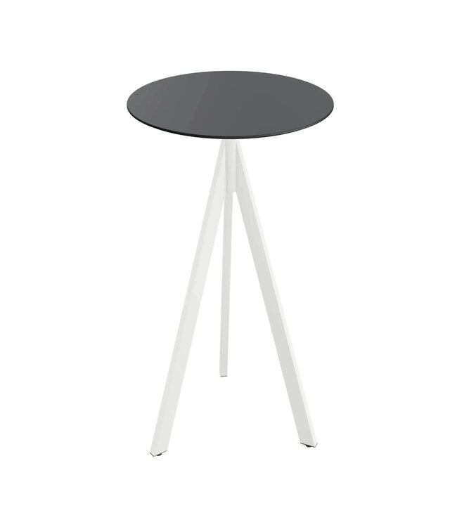 Infinity Tripod Bartafel met wit drieteens onderstel en een rond tafelblad gemaakt van HPL (High Pressure Laminate). Ronde horeca tafel met een zwart tafelblad geschikt voor moderne restaurants en gezellige terrassen. Na gebruik klapt u de Infinity Tripod tafel weer eenvoudig in. Ruimtebesparend wanneer u de tafel niet meer gebruikt. Deze inklapbare bartafel is ook beschikbaar met frame in het zwart of zandkleur/beige, een tafelblad met houtlook of marmerlook. Mix & match de bartafels zodat ze aansluiten op uw interieur. Word gedemonteerd geleverd en is eenvoudig in elkaar te zetten.