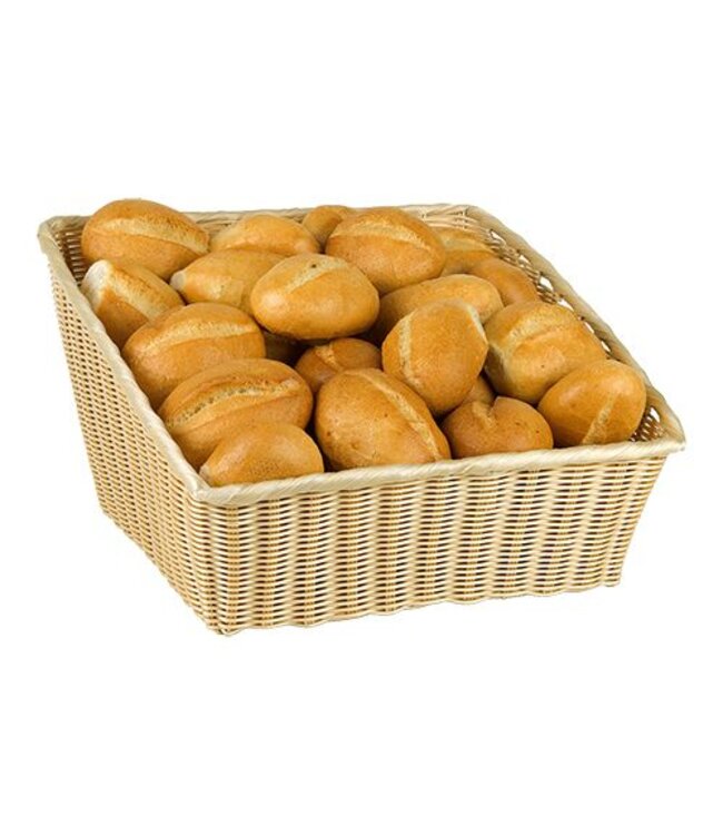 Broodmand gemaakt van polypropyleen vlechtwerk. Hoogte van aflopen 24cm tot 18cm, lengte 45cm, breedte 42cm en gewicht 1kg. Leuk om bijvoorbeeld een ontbijt of lunch buffet mee te presenteren.Â