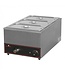 Bain-marie met een diepgetrokken naadloze 1/1GN compartiment, hierdoor is dit product ook gemakkelijk te reinigen. De totaal 1/1GN maat is verdeeld over: 3x 1/3GN. Met regelbare thermostaat, controlelampje, ingebouwd element en aftapkraan. Geschikt voor GN bakken van maximaal 15cm diep (GN bakken worden niet meegeleverd) 53x32,5cm. Hoogte 25,5cm, lengte 59,5cm, breedte 35,4cm, gewicht 8kg, 230 volt, 1200 watt.