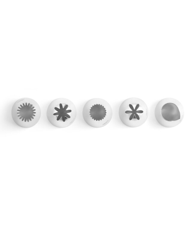 Deze set decoratie spuitmondjes is gemaakt van roestvast staal materiaal. De set bestaat uit 5 gekarteld/gladde spuitmondjes, waarvan 2x closed Star, 1x drop Flower, 1x french Star en 1x V-shaped. De spuitmondjes zijn extra nauwkeurig dankzij de scherpe randen.
