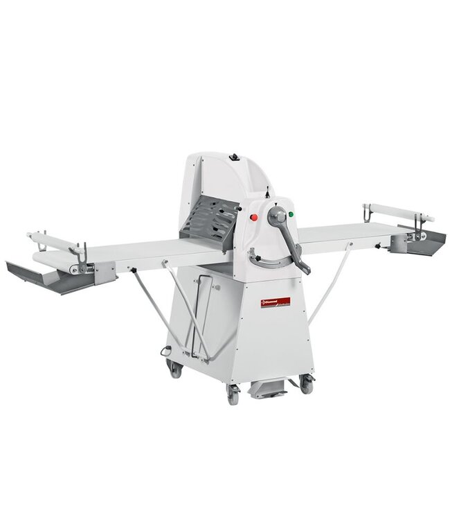 Professionele deegroller machine. Deze machine is ideaal voor diverse soorten deegwaren zoals: bladerdeeg, zacht deeg, deeg voor broodjes enzovoorts. Daarnaast heeft de machine een transportband met een joystick en mechanische bedieningselementen. De machine heeft een bedieningselementen voor het bedienen met de hand en een pedaal. Er is één snelheid aanwezig en er zijn opklapbare zijtafels van 100x50cm. De cilinderlengte is 50cm de opening van de rol 0 - 36mm en de wals diameter is 60mm. De rijsnelheid is 35 meter per minuut en er zijn standaard twee deegrollen en twee roestvrijstalen oogststations aanwezig. Ook is er een precieze regeling van de dikte van de deegplaat en dit zorgt voor een ideale productie. Er is een oogstbak onder de cilinders en de machine is uitgevoerd in gelakt staal. Daarnaast zijn er roosters voor rolbescherming die zijn gemaakt van RVS en er is een bak voor de bloem.
