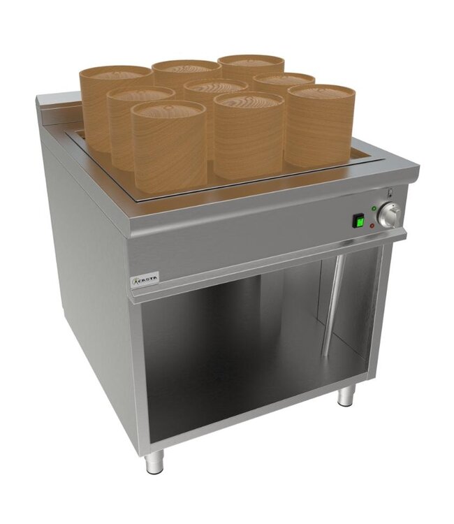 De verwarmingselementen van de dim sum stomer kunnen alleen worden ingeschakeld wanneer het waterbad voorzien is van genoeg water. Vult automatisch met water met vaste wateraansluiting maar als het nodig is, is handmatig vullen is ook mogelijk. Waarschuwingslampjes geven aan wanneer de verwarmingselementen zijn ingeschakeld. Met hittebestendige regelknoppen voorkomt u dat u uw handen verbrand. AISI 304 Roestvrijstalen poten zorgen dat de dim sum stomer stabiel in uw keuken staat. Dit model dim sum stomer is ook verkrijgbaar met een krachtiger vermogen.