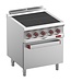Elektrisch fornuis met vier verlaagde kookplaten van 30x30cm en een convectieoven. Het fornuis is gemaakt van AISI 304 roestvrijstaal. Daarnaast zijn de poten in hoogte verstelbaar en is de bovenkant 1,5mm dik. Aan de achterkant zit er een schoorsteen van RVS. De plaat is van gietijzer, heeft een dikte van 40mm en er is een snelle stijging van de temperatuur. Er is een veiligheidsapparaat aanwezig voor het geval van oververhitting. De kookoppervlakte heeft een waterdichtheid van IPX4. Daarnaast is er een schakelaar met 7 standen voor elke zone met een controle lampje. Er is een afvalbak aanwezig aan de voorzijde. Bovendien is het fornuis eenvoudig te reinigen en te onderhouden. De temperatuurregeling van de oven ligt tussen de 70°C en 270°C. Bovendien is er 1 rooster aanwezig.