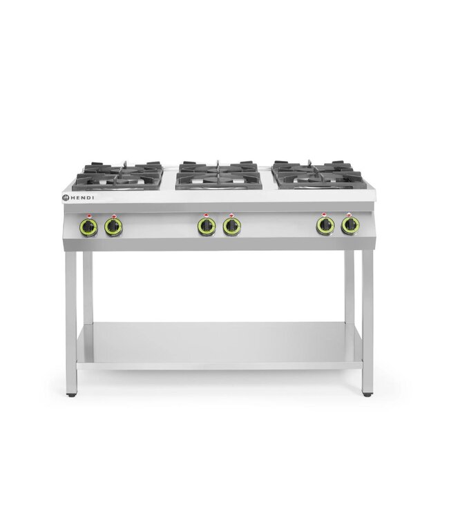 Gasfornuis gemaakt van RVS, met zes gietijzeren pandragers van 335x300mm. Het fornuis is geschikt voor potten en pannen met een diameter vanaf 120 tot 300mm. Voorzien van thermokoppel en in hoogte verstelbare poten.