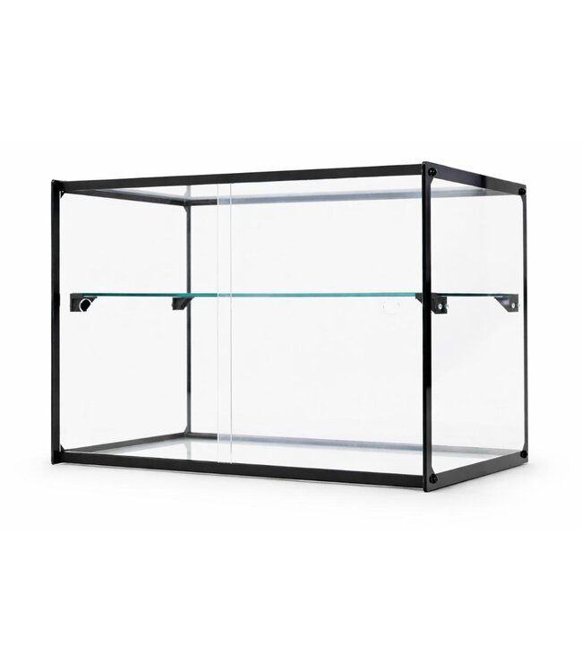 De vitrine is uitgevoerd in helder glas en heeft een tijdloze, neutrale uitstraling die past in uiteenlopende omgevingen, zoals bakkerijen, lunchzaken en winkels. Dankzij de opening aan de achterzijde is de vitrine eenvoudig toegankelijk en tevens geschikt voor zelfbediening.