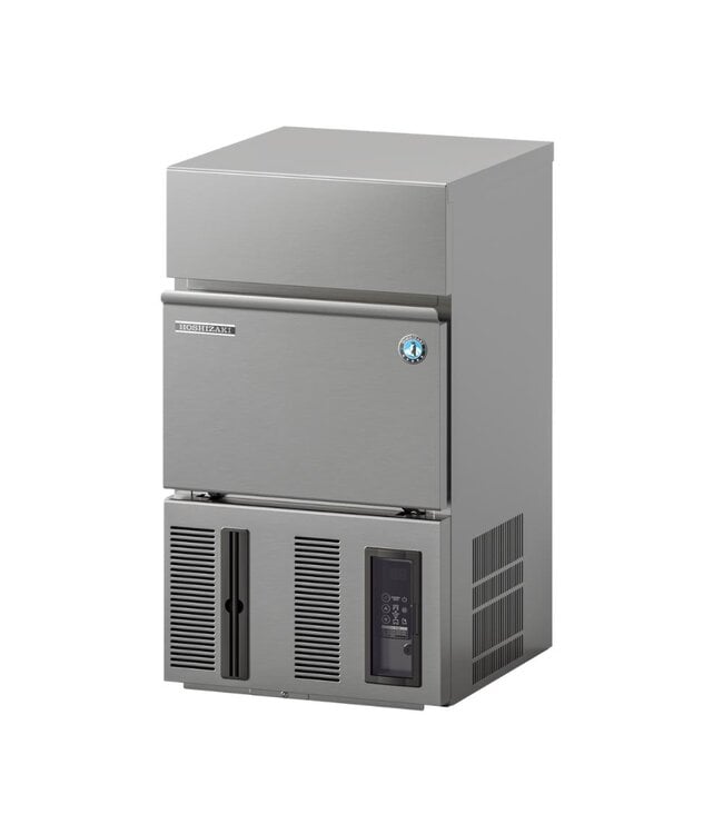 Compacte en professionele ijsblokjesmachine van het merk Hoshizaki, gemaakt van RVS. Het gaat om een compacte uitvoering om bijvoorbeeld eenvoudig onder de bar te plaatsen. Dit model heeft een productiecapaciteit van 30 kilo per 24 uur en een bunkercapaciteit van maar liefst 11,5 kilo. De ijsblokjes zijn rechthoekig en hebben de volgende afmetingen: breedte 28 mm, diepte 28 mm, hoogte 32 mm (large).Â