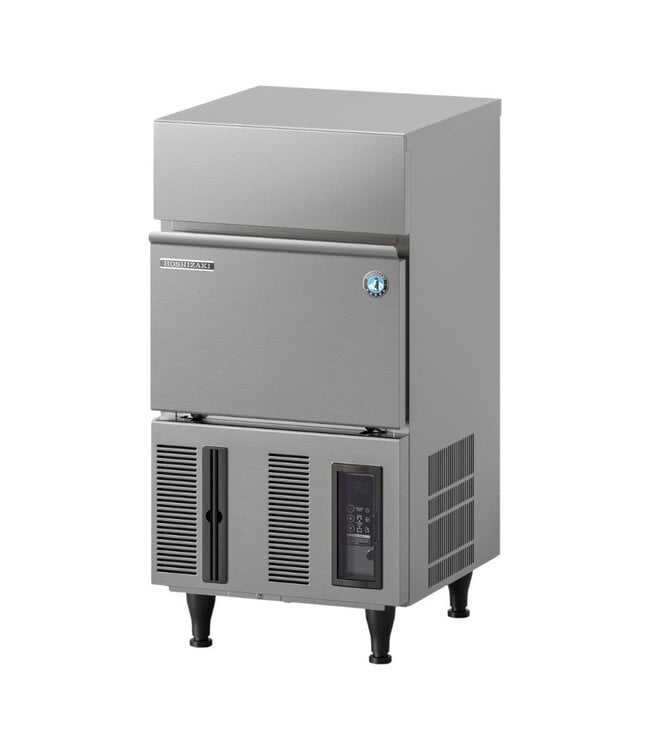Compacte en professionele ijsblokjesmachine van het merk Hoshizaki, gemaakt van RVS. Het gaat om een compacte uitvoering om bijvoorbeeld eenvoudig onder de bar te plaatsen. Dit model heeft een productiecapaciteit van 34 kilo per 24 uur en een bunkercapaciteit van maar liefst 11,5 kilo. De ijsblokjes zijn rechthoekig en hebben de volgende afmetingen: breedte 28 mm, diepte 28 mm, hoogte 32 mm (large).Â
