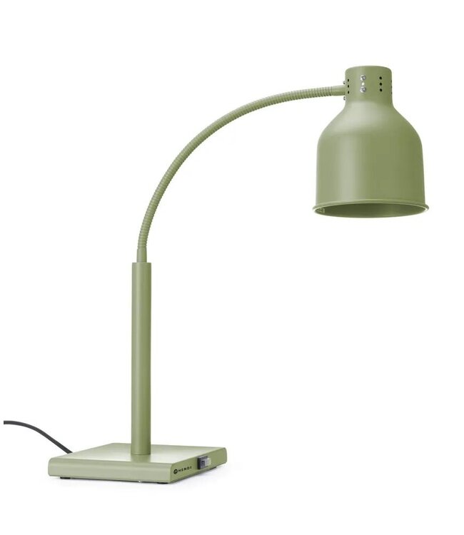 Infrarood keuken warmtelamp met groen rvs frame, aluminium lampenkap en flexibele arm zodat de lamp nauwkeurig schijnt op uw gerecht. Ideaal om eten warm te houden tussen het bereiden en serveren in de horeca. Stijlvolle lamp geschikt voor op de toonbank maar ook bij buffetten. Voorzien van een antiroestcoating, simpele en gebruiksvriendelijke schakelaar. Wordt geleverd met lampen bestand tegen versplintering en een 1500 mm lange stroomkabel.