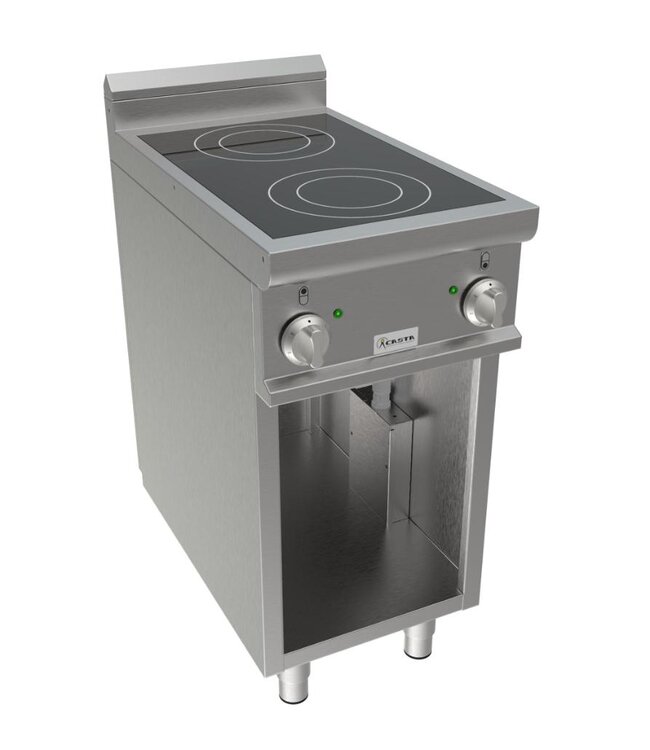 De kookzones zijn gemarkeerd om de juiste plaatsing van de pannen makkelijker te maken. De kookzones zijn onafhankelijk te regelen met twee vermogensstanden. Waarschuwingslampjes geven aan wanneer de kookzones zijn ingeschakeld. Met hittebestendige regelknoppen voorkomt u dat u uw handen verbrand. AISI 304 Roestvrijstalen poten zorgen dat de kookplaat stevig op elk werkstation staat. Dit compacte staande model is flexibel te plaatsen in uw keukeninrichting. Onder de kookplaat heeft dit apparaat een open onderkast voor extra opbergruimte van keukengereedschappen.