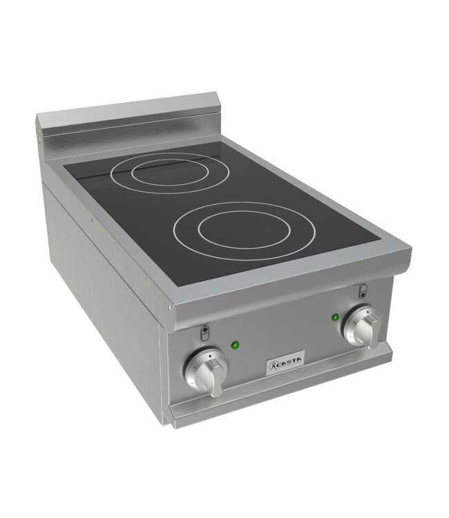 Keramische elektrische kookplaat met keramisch glas van 6 mm dik voor professioneel gebruik in de horeca keuken. Dit glas is geschikt voor dagelijks intensief gebruik in een drukke keuken. Volledig gemaakt van AISI 304 roestvrij staal. Hygiënisch en eenvoudig te reinigen kookoppervlak. Bovendien is de glazen kookplaat waterdicht om lekkage te voorkomen. Cirkelvormige verwarmingselementen (elk 2,5 kW) met dubbele verwarmingscircuits.