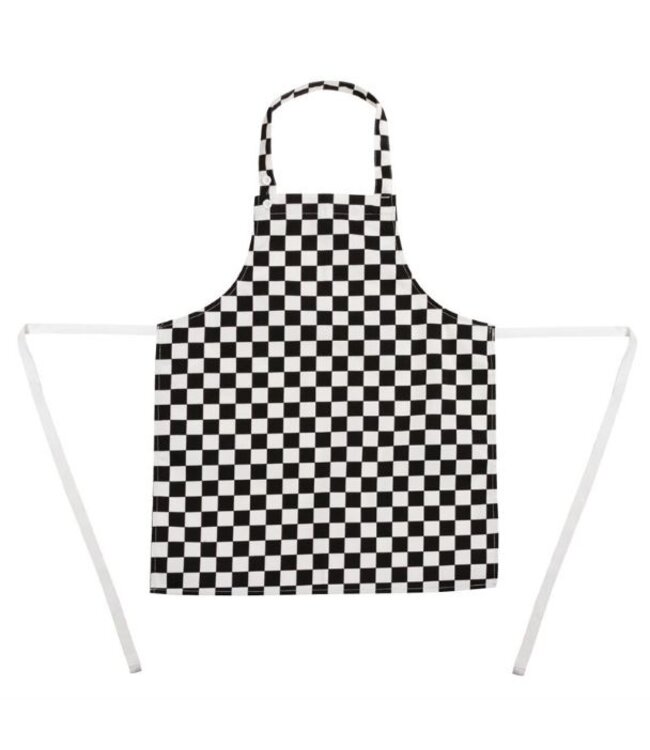 Zwart-wit geruit Kinderschort gemaakt van katoen. Het schort is geschikt voor kinderen van 5 tot 10 jaar en is voorzien van een verstelbare halter voor extra comfort. Uitstekend te combineren met de andere kinder kokskleding uit ons assortiment. afmetingen: lengte 68,5cm, breedte 51cm.