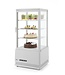 Gekoelde witte vitrine tafelmodel met drie schappen gemaakt van RVS behuizing met coating, voorzien van dubbelglas en eenvoudig te openen deur. Beschikt over een geventileerd koelsysteem met automatische ontdooi functie, temperatuurbereik van 0 tot 12 graden. Het luchtkanaal buiten het glas voorkomt en verwijdert condensatie op het glas. Er is interne verlichting aanwezig in het plafond en de schappen zijn duurzaam voorzien van een PVC coating en in hoogte verstelbaar. De thermostaat en het display zijn digitaal en de voetjes zijn verstelbaar.