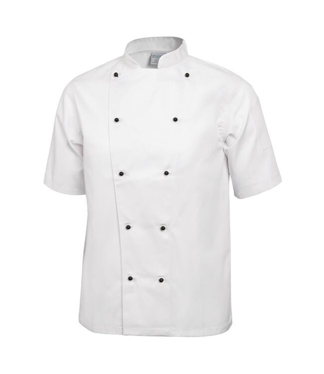 Stijlvolle witte koksbuis met korte mouwen gemaakt van polyester en katoen. De koksbuis is voorzien van een dubbele sluiting en verwijderbare zwarte bolknopen. Op de linkermouw is een thermometerzakje bevestigd. Verkrijgbaar in de maten M tot en met XL