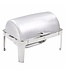 Chafing dish in een rechthoekig gepolijst 18/8 RVS model (GN 1/1 maat) met roltop deksel op poten (RVS). Inclusief waterpan, voedselpan, deksel en twee brandpastahouders. Zeer professioneel model voor het warmhouden, presenteren en afdekken van meerdere gerechten tijdens een buffet. Veel gebruikt in (grootschalige) hotels en restaurants. Gemakkelijk te reinigen. Inhoud 9 liter. De chafing dish heeft de afmetingen 44cm(h) x 67,5cm(b) x 53cm(d) en is zilver van kleur.