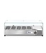 Koelvitrine opzetmodel met binnen- en buitenzijde gemaakt van RVS, met vitrine van gehard glas. Statische koeling met gekoelde binnenbak en EMBRACO compressor met een temperatuurbereik van -2 tot +8 graden. Isolatiemateriaal 40cm dik C5H10 met automatische defrost functie.