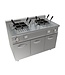 De hoeken van de kuipen zijn afgerond waarmee deze grote pastakoker heel makkelijk schoon te maken is. Robuuste behuizing volledig gemaakt van AISI 304 roestvrijstaal. Het werkblad is 2 mm dik met overloopafvoersysteem, afdruiprek voor mandjes en ingebouwde schoorsteen aan de achterkant. Leeg de pastakoker heel makkelijk met de aftapkranen aan de voorkant. Met hittebestendige regelknoppen voorkomt u dat u uw handen verbrand tijdens het koken. Verstelbare RVS poten zorgen dat de pastakoker stevig staat op de juiste werkhoogte.