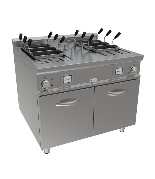 Grote elektrische Casta Lady Q 900 pastakoker voor professioneel gebruik in de horeca. U kunt er veel pasta tegelijk in koken, maar ook noedels, rijst, groenten en andere producten. Met twee grote kuipen kan er 2x 40 liter in deze pastakoker. Compleet geleverd inclusief 6x 1/3GN pastamanden.