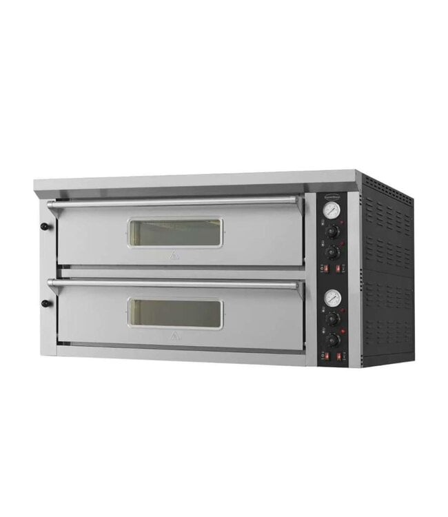 Dubbele elektrische pizzaoven 2 x 6 - ideaal voor pizzeria's, restaurants die op zoek zijn naar kwaliteit en snelheid. Met krachtige verwarmingselementen en het warmteverdelingssysteem bakt deze Combisteel pizzaoven moeiteloos meerdere pizza's in één keer. Uitgerust met twee aparte ovenkamers waarmee apart meerdere pizza's gebakken kunnen worden. Dankzij de ingebouwde ledverlichting kunt u het bakproces goed in de gaten houden. Geschikt voor acht pizza's van 33cm in diameter. De temperatuur van beide kamers is heel makkelijk afzonderlijk in te stellen met de praktische draaiknoppen. Bovendien eenvoudig af te lezen van de analoge thermometers. Bak de lekkerste pizza's met een temperatuurbereik tot +350 graden.