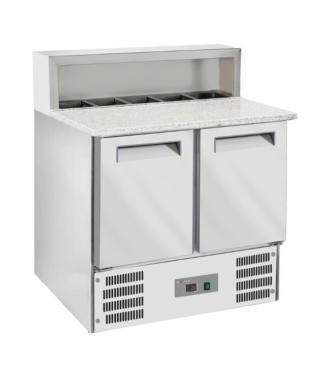 Diverso by Diamond pizzawerkbank met 2 deuren, bovenkoeling en een compact ontwerp perfect voor keukens waar ruimte beperkt is. Uitgerust met granieten werkblad ideaal tijdens het beleggen van pizza's. Het deeg plakt minder snel aan het werkblad vast. Op de 5x 1/6GN bovenkoeling is de werkbank voorzien van RVS plank. Compacte opslag met 2 deuren compleet geleverd met twee 1/1GN roosters.