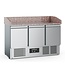 Geforceerde pizzawerkbank met 3 deuren, een zwart granieten werkblad voor het bereiden van pizza's en RVS behuizing met geforceerd koelsysteem. Uitgerust met automatisch ontdooiing. Het zwarte granieten werkblad is gemaakt van natuurlijk graniet waardoor er lichte kleurverschillen kunnen zijn.