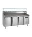 Pizzawerkbank met opzetkoelvitrine, 3 deuren en granieten werkblad voor het bereiden van heerlijke pizza's. Combineert een professionele koeling met een granieten werkblad waar u elke dag pizza's op kunt bereiden. Het granieten werkblad blijft goed koel en voorkomt dat deeg aan het tafelblad blijft plakken. In de opzetkoelvitrine is er ruimte voor het organiseren van verschillende ingrediënten en toppings in 1/3GN bakken. Stel de temperatuur makkelijk in met elektronische temperatuurregelaar. Dit model is ook verkrijgbaar zonder de opzetkoelvitrine voor toppings, bekijk hiervoor de gerelateerde producten. Op aanvraag is dit model beschikbaar met ladenblokken in plaats van deuren.