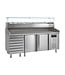 Pizzawerkbank met opzetkoelvitrine, 2 deuren, 7 ongekoelde deeglades en granieten werkblad voor het bereiden van heerlijke pizza's. Combineert een professionele koeling met een granieten werkblad waar u elke dag pizza's op kunt bereiden.