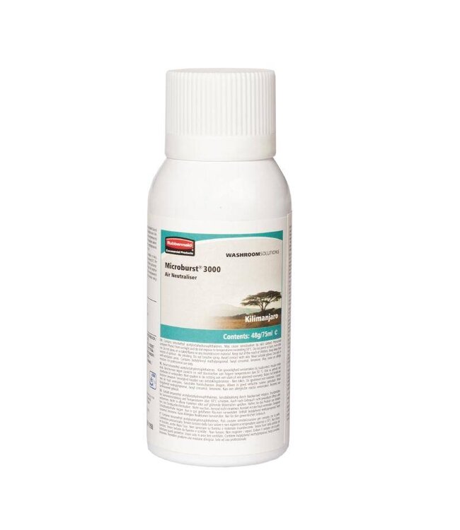 Navulling van Rubbermaid Microburst voor de automatische luchtverfrisser. Per 12 stuks geleverd. Iedere navulling is goed voor tot wel 3000 sprays. Geur ''kilimanjaro'', oriëntaalse geur met kruiden, zoete balsem en hars.