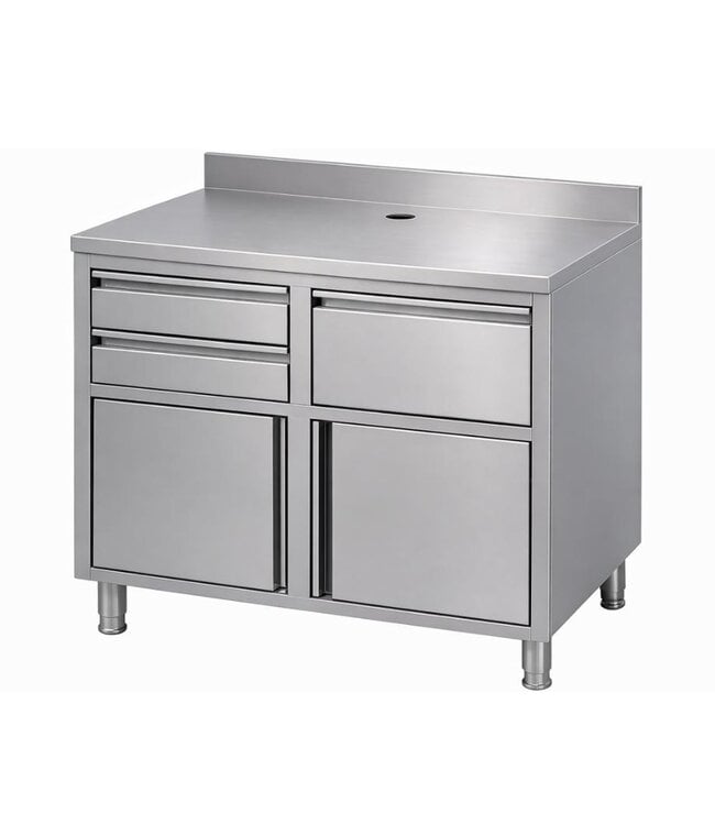 RVS Koffiemeubel voor de horeca met twee klapdeuren en 3 lades (waarvan 1 een afkloplade). Een stevig roestvrijstalen meubel te gebruiken als werkbank in uw koffiecorner. Deze koffiemeubel is een handige kast voor het plaatsen koffiemachines en toebehoren. Aan de achterzijde van het RVS werkblad is de koffiewerktafel voorzien van een opstaande rand. Zo valt er niets ongewenst achter de kast. Dit model is voorzien van 2 klapdeuren en 3 lades. Het roestvrijstaal is bestand tegen intensief gebruik in drukke keukens. Bovendien een handig werkstation voor elke barista.