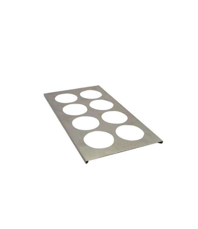 Praktische houder gemaakt van RVS voor plaatsing op een 1/3 Gastronormbak. De houder is geschikt voor 8 (fifo)sausflessen met een inhoud van 355 ml en 473 ml. Afmetingen van de gaten: 8x Ø63.5 mm.