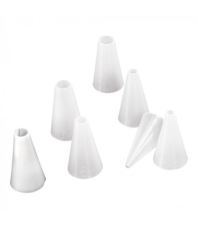 Spuitmondjes set gemaakt van nylon, 7 stuks glad van vorm. Met diameters variërend van 3mm-16mm en gewicht 0.005kg.