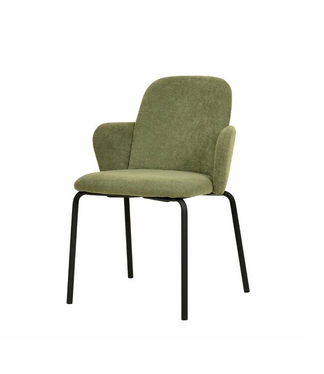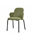 Stijlvolle eetkamer stoel met armleuningen en gestoffeerde zitting in het groen. Sfeervol design ideaal voor restaurants, bars, hotel lobby's en andere horeca gelegenheden. De zitting is bekleed met comfortabel stof voor een luxe uitstraling. Uitgevoerd met een stevig stalen frame. De stoelen zijn stapelbaar waarmee ze compact en ruimtebesparend kunnen worden opgeborgen.
