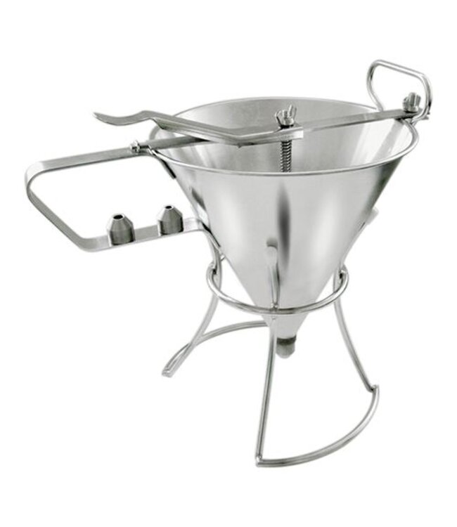 Louis Tellier doseertrechter gemaakt van roestvrijstaal. Ideaal voor het gieten van glazuur, sauzen of fondant en ook geschikt voor poffertjes. Beschikt over 2 uitloopdoseringen en wordt geleverd inclusief standaard. Dit product heeft een diameter van 18,5cm, inhoud 1,9l en gewicht 1kg.
