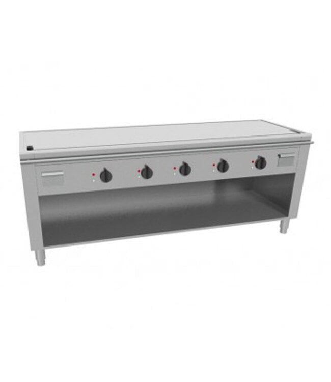 Elektrische teppanyaki grill met een gladde chroom bakplaat van 15 mm dik. Perfect voor kleine Aziatische restaurants. Deze plaat is uitgevoerd met hoge warmtegeleiding geschikt om te grillen op hoge temperaturen. Compleet gemaakt van AISI 304 roestvrijstaal en uitgerust met elektrische verwarmingselementen die de teppanyaki grill een vermogen van 27 kW geven. Aan de rand heeft de grill een groef waarmee resten zoals olie of vet worden opgevangen in de opvangbak. Het regelen van de temperatuur werkt veilig dankzij de hittebestendige draaiknop. Dit model werkt op elektra, er is ook een uitvoering op gas verkrijgbaar.