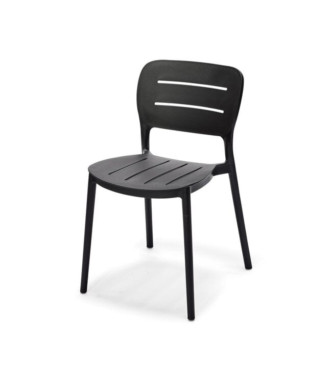 Terrasstoel Propi met klassiek design in het zwart gemaakt van kunststof. Perfect op het terras - ideaal voor restaurants, bars en andere horeca gelegenheden. Tuinstoel compleet gemaakt van polypropyleen kunststof waarmee ze zeer geschikt zijn voor buitengebruik. De stoelen zijn stapelbaar waarmee ze compact en ruimtebesparend kunnen worden opgeborgen. Ontwerp met afgeronde hoeken dat eenvoudig schoon te maken is. De zitting van de stoel heeft 4 sleuven zodat regenwater niet op de stoel blijft liggen. Zo kunnen de stoelen ook tijdens een regenbui buiten blijven staan.