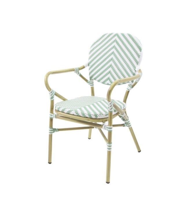 Bistro Terrasstoel met armleuningen en rotan zitting in het wit met pastel groen. Perfect op het terras - ideaal voor restaurants, bars en andere horeca gelegenheden. De zitting is bekleed met comfortabel rotan. Uitgevoerd met een stevig aluminium frame. De stoelen zijn stapelbaar waarmee ze compact en ruimtebesparend kunnen worden opgeborgen.