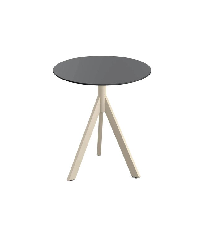 Infinity Tripod Terrastafel met beige drieteens onderstel en een rond tafelblad gemaakt van HPL (High Pressure Laminate). Ronde horeca tafel met een zwart tafelblad geschikt voor moderne restaurants en gezellige terrassen. Na gebruik klapt u de Infinity Tripod tafel weer eenvoudig in. Ruimtebesparend wanneer u de tafel niet meer gebruikt. Deze inklapbare tafel is ook beschikbaar met frame in het wit of zwart, een tafelblad met houtlook of marmerlook. Mix & match de tafels zodat ze aansluiten op uw interieur. Word gedemonteerd geleverd en is eenvoudig in elkaar te zetten.