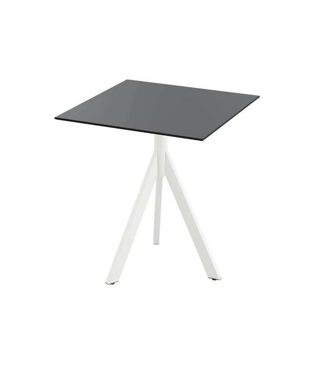 Infinity Tripod Terrastafel met wit drieteens onderstel en een vierkant tafelblad gemaakt van HPL (High Pressure Laminate). Vierkante horeca tafel met een zwart tafelblad geschikt voor moderne restaurants en gezellige terrassen. Na gebruik klapt u de Infinity Tripod tafel weer eenvoudig in. Ruimtebesparend wanneer u de tafel niet meer gebruikt. Deze inklapbare tafel is ook beschikbaar met frame in het zwart of zandkleur/beige, een tafelblad met houtlook of marmerlook. Mix & match de tafels zodat ze aansluiten op uw interieur. Word gedemonteerd geleverd en is eenvoudig in elkaar te zetten.