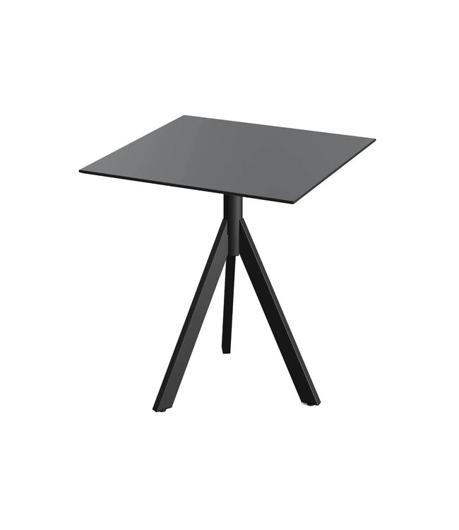 Infinity Tripod Terrastafel met zwart drieteens onderstel en een vierkant tafelblad gemaakt van HPL (High Pressure Laminate). Vierkante horeca tafel met een zwart tafelblad geschikt voor moderne restaurants en gezellige terrassen. Na gebruik klapt u de Infinity Tripod tafel weer eenvoudig in. Ruimtebesparend wanneer u de tafel niet meer gebruikt. Deze inklapbare tafel is ook beschikbaar met frame in het wit of zandkleur/beige, een tafelblad met houtlook of marmerlook. Mix & match de tafels zodat ze aansluiten op uw interieur. Word gedemonteerd geleverd en is eenvoudig in elkaar te zetten.