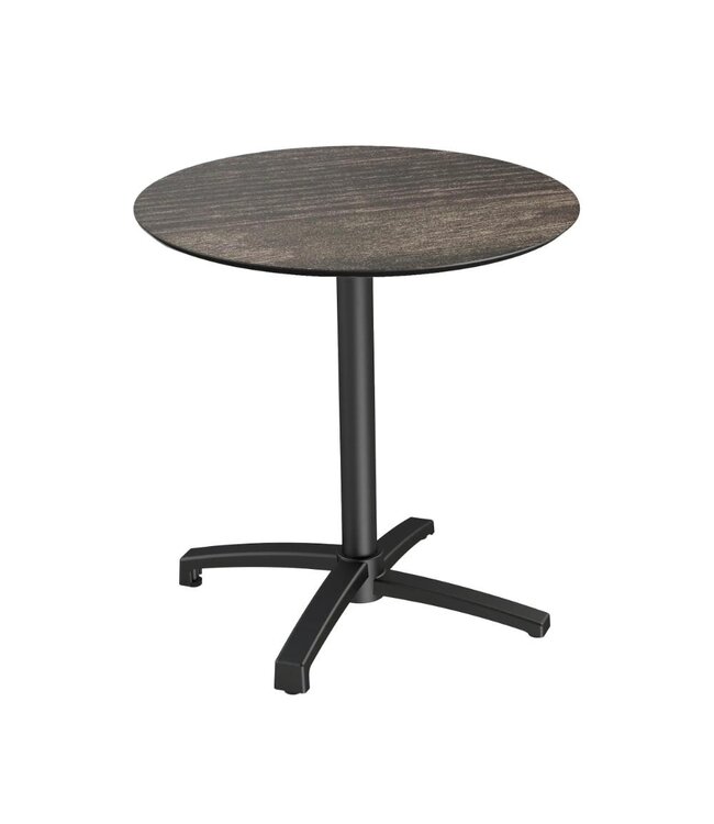 X Cross Terrastafel met zwart frame en een rond tafelblad gemaakt van HPL (High Pressure Laminate). Ronde horeca tafel met een houtlook tafelblad geschikt voor moderne restaurants en gezellige terrassen. Na gebruik klapt u de X Cross tafel weer eenvoudig in. Ruimtebesparend wanneer u de tafel niet meer gebruikt. Deze inklapbare tafel is ook beschikbaar met frame in zandkleur/beige, een tafelblad in het zwart of met marmerlook. Mix & match de tafels zodat ze aansluiten op uw interieur. Word gedemonteerd geleverd en is eenvoudig in elkaar te zetten.