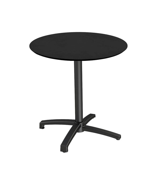 X Cross Terrastafel met zwart frame en een rond tafelblad gemaakt van HPL (High Pressure Laminate). Ronde horeca tafel met een zwart tafelblad geschikt voor moderne restaurants en gezellige terrassen. Na gebruik klapt u de X Cross tafel weer eenvoudig in. Ruimtebesparend wanneer u de tafel niet meer gebruikt. Deze inklapbare tafel is ook beschikbaar met frame in zandkleur/beige, een tafelblad met houtlook of marmerlook. Mix & match de tafels zodat ze aansluiten op uw interieur. Word gedemonteerd geleverd en is eenvoudig in elkaar te zetten.