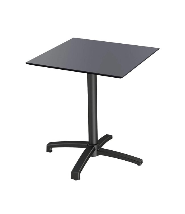 X Cross Terrastafel met zwart frame en een vierkant tafelblad gemaakt van HPL (High Pressure Laminate). Vierkante horeca tafel met een zwart tafelblad geschikt voor moderne restaurants en gezellige terrassen. Na gebruik klapt u de X Cross tafel weer eenvoudig in. Ruimtebesparend wanneer u de tafel niet meer gebruikt. Deze inklapbare tafel is ook beschikbaar met frame in zandkleur/beige, een tafelblad met houtlook of marmerlook. Mix & match de tafels zodat ze aansluiten op uw interieur. Word gedemonteerd geleverd en is eenvoudig in elkaar te zetten.
