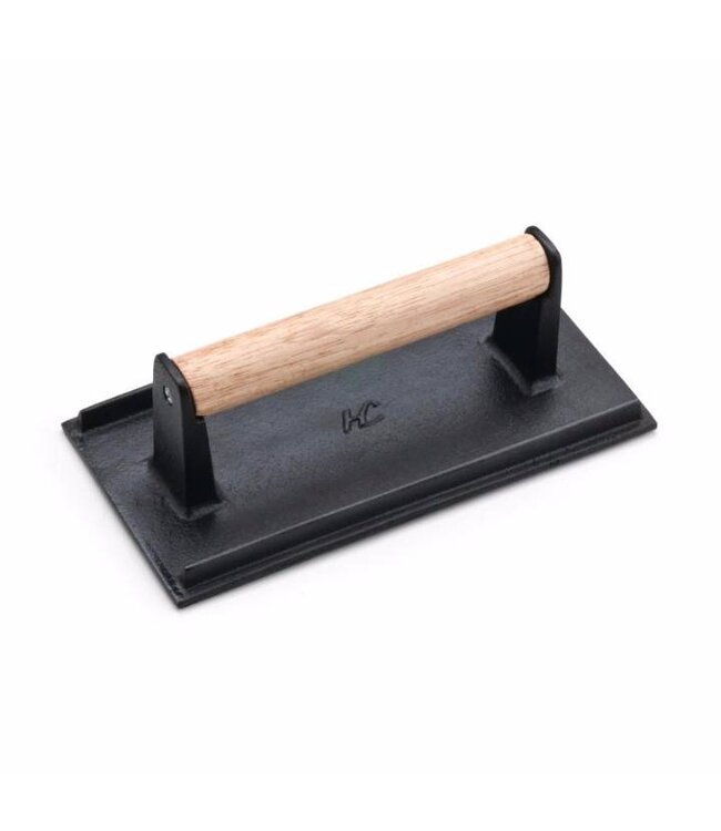 Vleespers van gietijzer en hout. Zeer handig voor het persen van bijvoorbeeld steaks of smash hamburgers, zonder dat de kwaliteit of de smaak van het vlees verloren gaat. Het gietijzer neemt de hitte van de grill en het vlees aan wat zorgt voor een versnelling van het garingsproces. Gewicht 120 gram. De vleespers heeft de afmetingen 65mm(h) x 210mm(b) x 110mm(d).