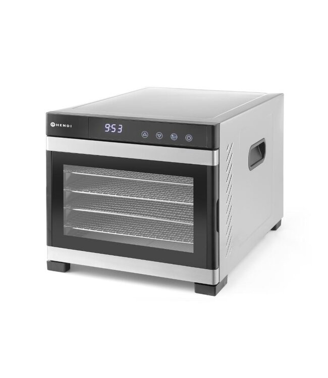Professionele voedseldroger met RVS behuizing en digitaal controlepaneel. Ideaal voor het drogen van fruit, groenten, kruiden, vlees, vis etc. De motor is extra stil en zorgt voor een horizontale luchtstroom waardoor de trays niet gedraaid hoeven te worden. De tijd is instelbaar tot 24 uur, in stappen van 30 minuten, de temperatuur is instelbaar van 35 tot 75 graden in stappen van 5 graden.