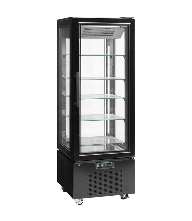 Presenteer gebak, desserts, taarten of broodjes met deze staande vriesvitrine van Tefcold. Met 5 niveaus heeft deze display vriesvitrine een inhoud van 364 liter. Een elegante vitrine met een frameloze deur, een zwart design en een RVS interieur met spiegeleffect. Heeft in elke hoek verticale ledverlichting zodat alle producten aantrekkelijk worden uitgelicht. Dankzij de dubbele beglazing blijven uw producten goed op temperatuur. Het geventileerde koelsysteem houdt uw producten langer vers ook wanneer de vitrine vaak wordt geopend. Perfect geschikt voor bakkerijen of restaurants, hotels en winkels met buffet.