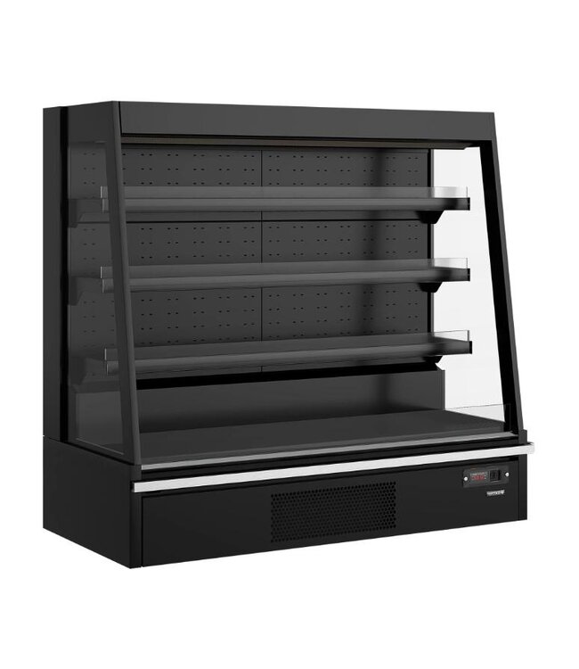 Ruime wandkoeling met een open front perfect voor supermarkten en winkels. Frameloos Galaxy+ design geschikt voor een doorlopende inrichting. Doordat deze wandkoeling niet heel hoog is wordt het zicht van uw klanten niet geblokkeerd in een eilandopstelling. Presenteer uw producten aantrekkelijk en overzichtelijk dankzij de verstelbare kantelbare planken. De zijwanden zijn voorzien van glas zodat er uitstekend zicht is rondom de kast. Compleet geleverd met etiket/prijsstrips en opstaande fronts van acryl. Met het geventileerde koelsysteem is dit een energiezuinige koeloplossing voor uw onderneming.